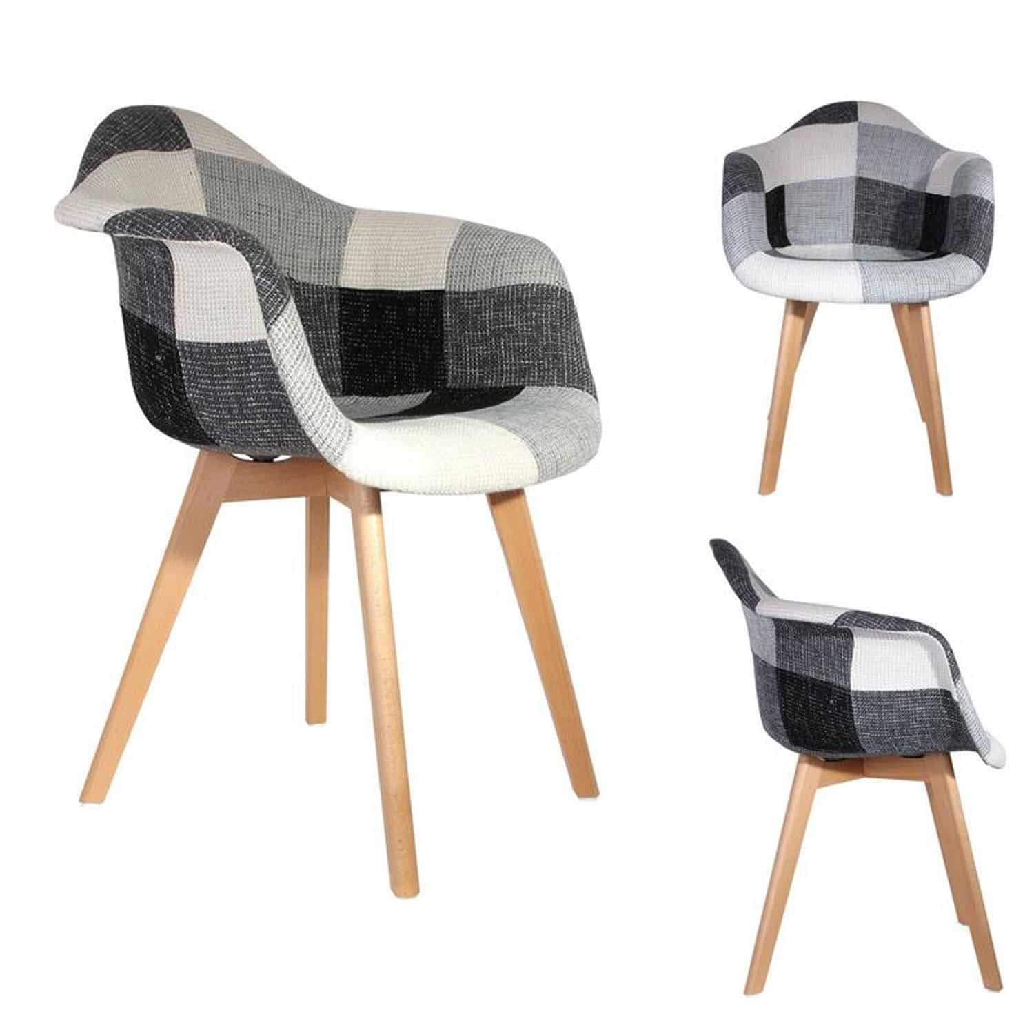 Deze set van 2 eetkamerstoelen is uitgevoerd in een zwart, grijze en creme patchwork. Door de beukenhouten poten passen de stoelen goed in een Scandinavische stijl. De stoelen hebben een speelse armleuning waardoor ze ook elders in de wo